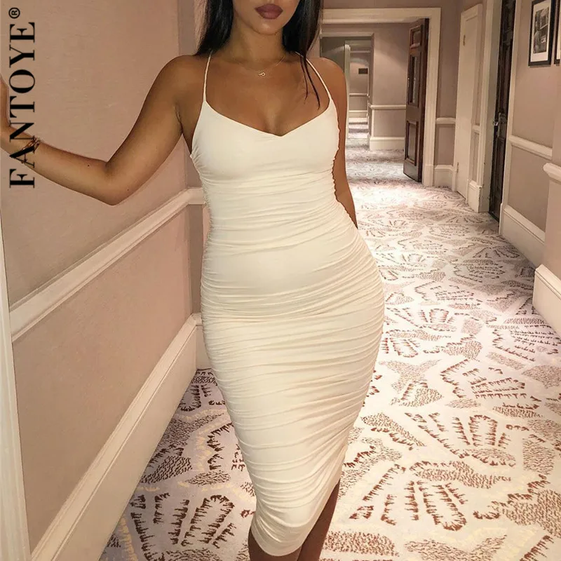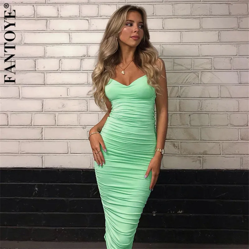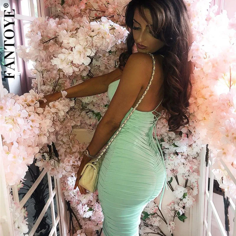 HIGH QUALITY FANTOYE Elegant Mint Ruched Women's Party Dress 2019 New Sexy Backless Bodycon Dress Femme Double L