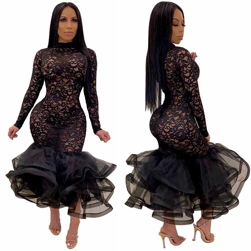 Sexy Floral Organza Sheer Mesh Lace Ruffle Patchwork Evening Party Dress 2020 Casual Long Sleeve Mo