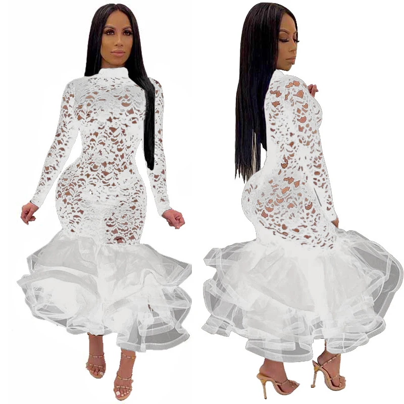 Hot Sale Sexy Floral Organza Sheer Mesh Lace Ruffle Patchwork Evening Party Dress 2020 Casual Long Sleeve Mo