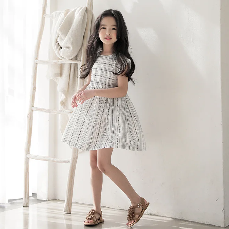 HOT SALE 2019 summer big girl sleeveless dress kids stripe Floral dress age 4-16 yrs teens girls party frock