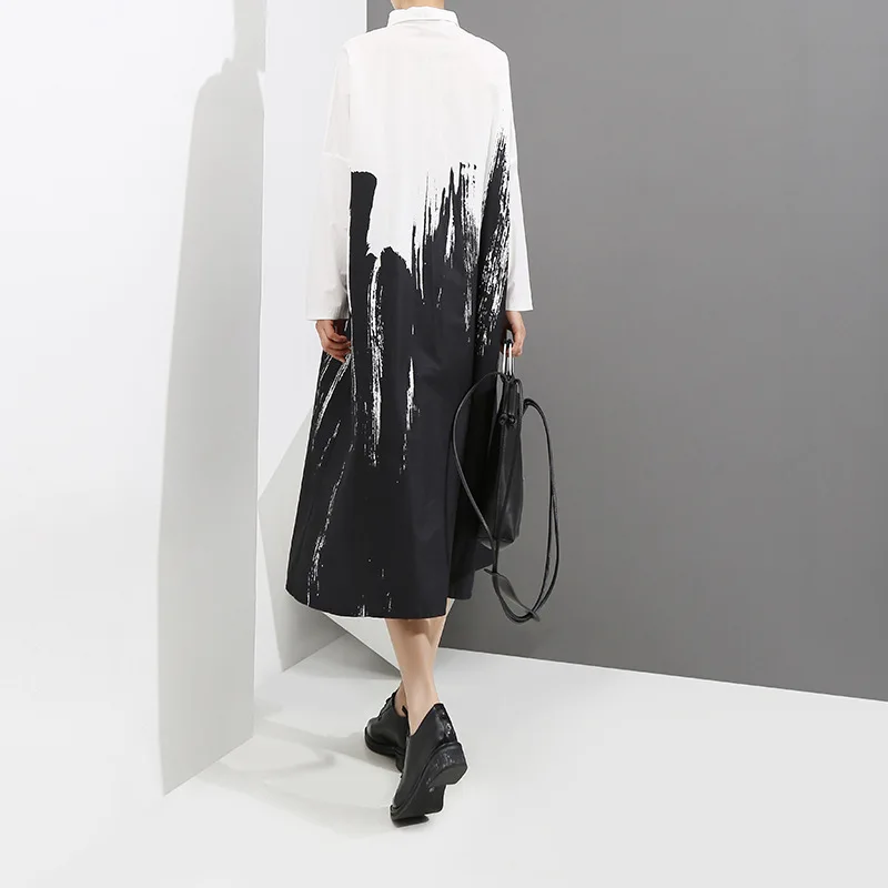 ORIGINAL 2020 Women Summer Black And White Print Shirt Dress Long Sleeve Tie-Dyed Lady Plus Size Midi Casual